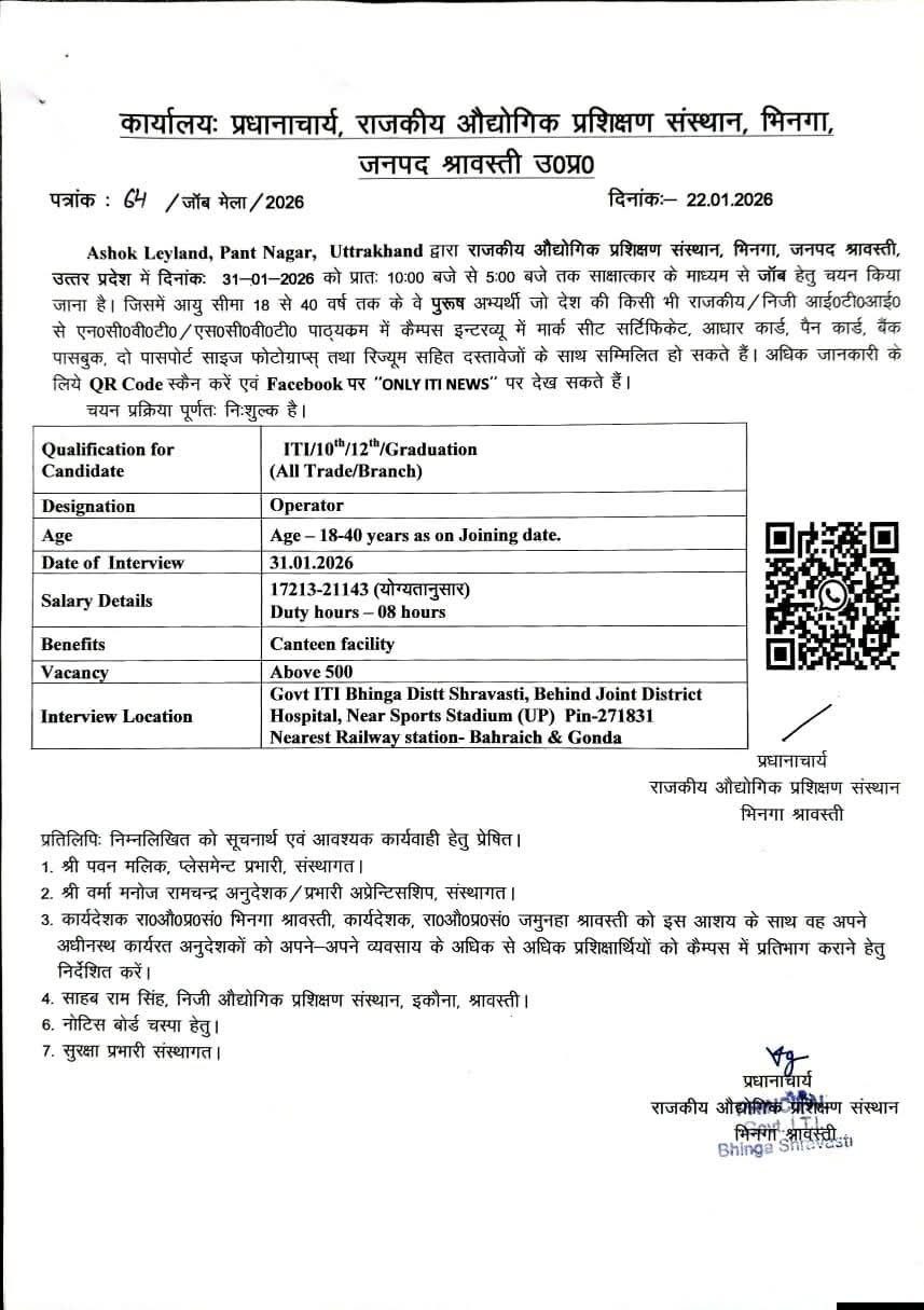 Ashok Leyland Recruitment 2026: सभी शिक्षित युवा जो काफी समय से एक अच्छी नौकरी के लिए सोच रहे है, उनके लिए यह एक अच्छा मौका है । Ashok Leyland Pvt Limited कंपनी सभी युवाओ को JOB करने का सुनहरा अवसर दे रही है । अतः जो भी युवा इस जॉब के लिए आवेदन करना चाहते है, वह अपने सभी जरूरी दस्तावेजों के साथ नीचे दिए स्थान पर दिए गए समय अनुसार उपस्थित होवे ।
