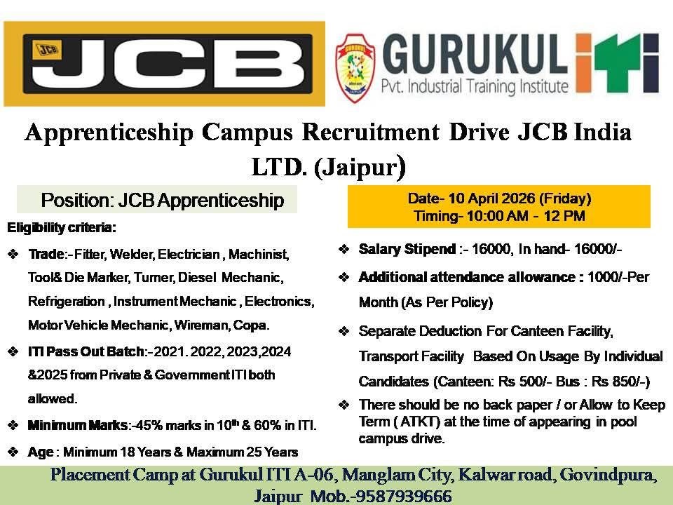 JCB India Recruitment 2026: Golden opportunity for all ITI pass youth to get job in JCB India Limited Company, campus placement will be organized on 10 April 2026. This campus placement will be organized at Gurukul ITI, Govindpura, Jaipur. All ITI pass youth will be able to participate in this campus drive. So, any youth who is willing to participate in this campus should reach the campus location given below with their necessary documents.