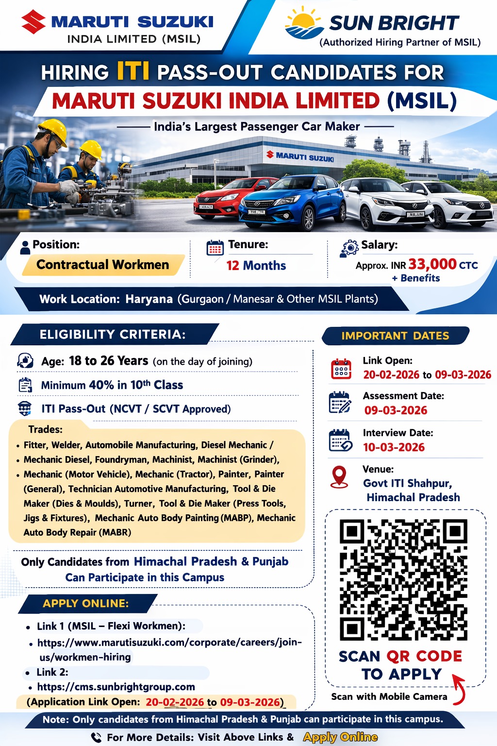 Maruti Suzuki कंपनी ने ITI पास युवाओं के लिए साल 2026 में CW (Contract Worker) पदों पर भर्ती निकाली है। यह उन उम्मीदवारों के लिए अच्छा मौका है जो ऑटोमोबाइल सेक्टर में नौकरी करना चाहते हैं। इस भर्ती में चुने गए उम्मीदवारों को कंपनी के अलग-अलग प्लांट्स में काम करने का अवसर मिलेगा और उन्हें हर महीने करीब ₹33,000 वेतन दिया जाएगा।
